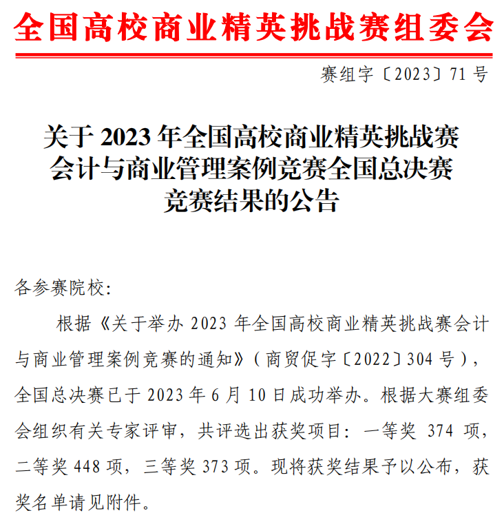 全国高校商业精英挑战赛会计与商业管理案例竞赛是中国高等教育学会所发布的《2023全国普通高校大学生竞赛分析报告》竞赛目录中的全国性赛事,旨在通过接触企业鲜活案例,亲历企业实践,模拟管理及决策过程,提升学生综合运用专业知识解决实际问题的能力,促进学生创新创业综合素质的提高。