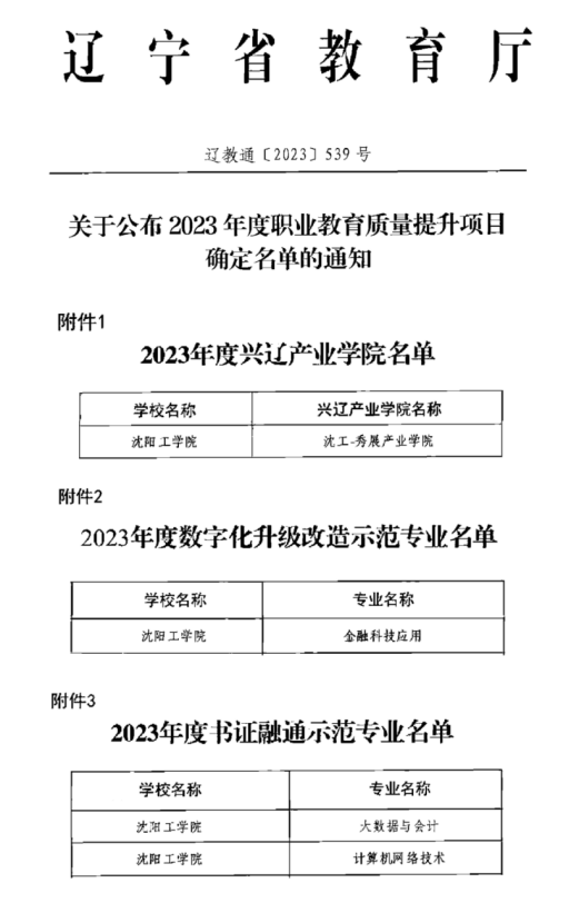 根据辽宁省教育厅《关于公布2023年度职业教育质量提升项目确定名单的通知》(辽教通〔2023〕539号)公布的结果,我校获批兴辽产业学院1项、数字化升级改造示范专业1项、书证融通示范专业项目2项。