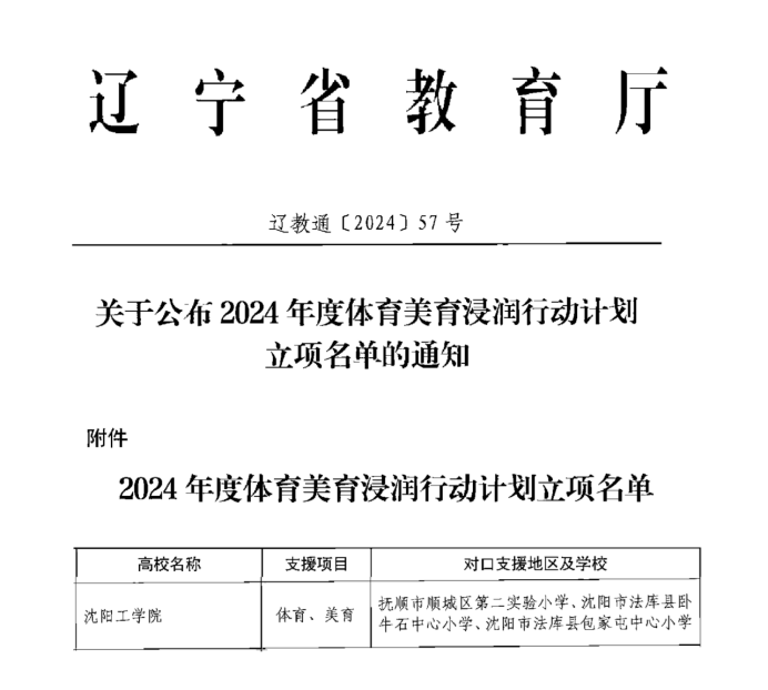 近日,辽宁省教育厅发布了《关于公布2024年度体育美育浸润行动计划立项名单的通知》,我校的体育、美育项目入选2024年度体育美育浸润行动计划立项名单,主要对口支援地区及学校为抚顺市顺城区第二实验小学、沈阳市法库县卧牛石中心小学和沈阳市法库县包家屯中心小学。