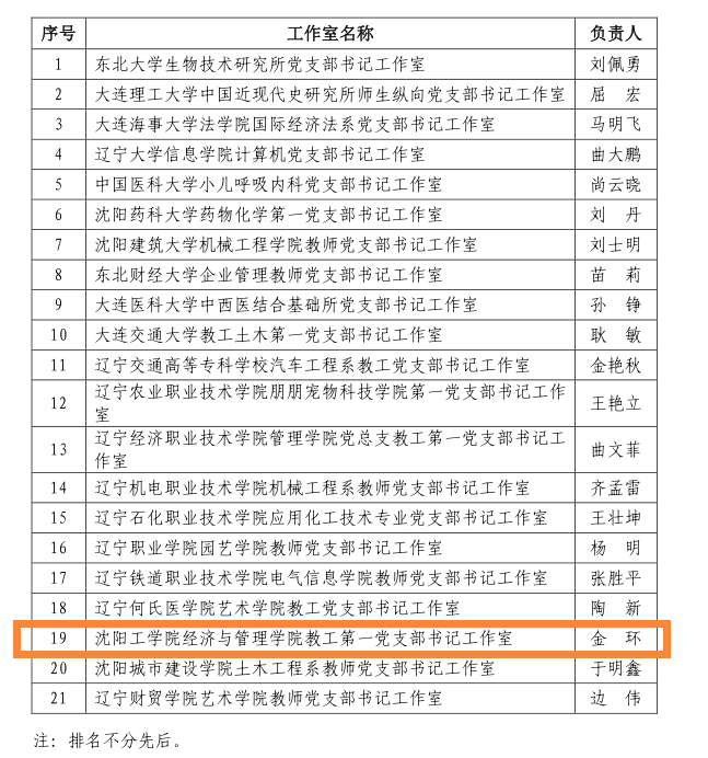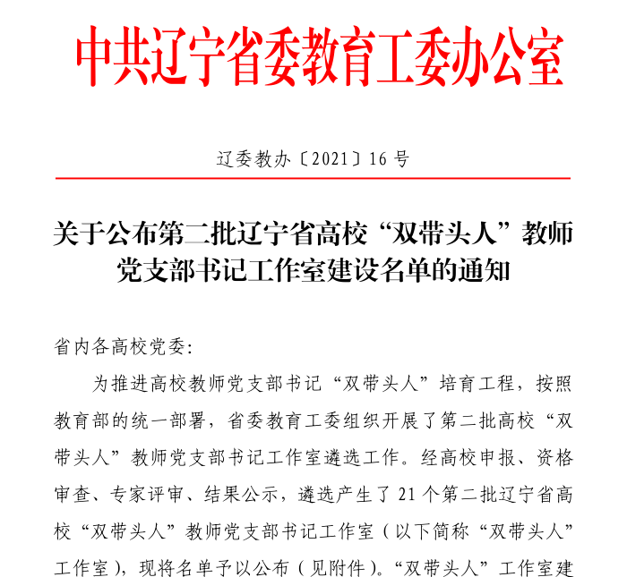 近期,辽宁省委教育工委印发《关于公布第二批辽宁省高校“双带头人”教师党支部书记工作室建设名单的通知》(辽委教办〔2021〕16号)文件,我校经济与管理学院教工第一党支部书记工作室(以下简称“工作室”)入选第二批辽宁省高校“双带头人”教师党支部书记工作室。