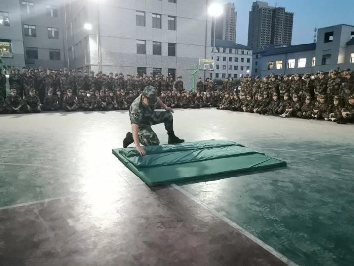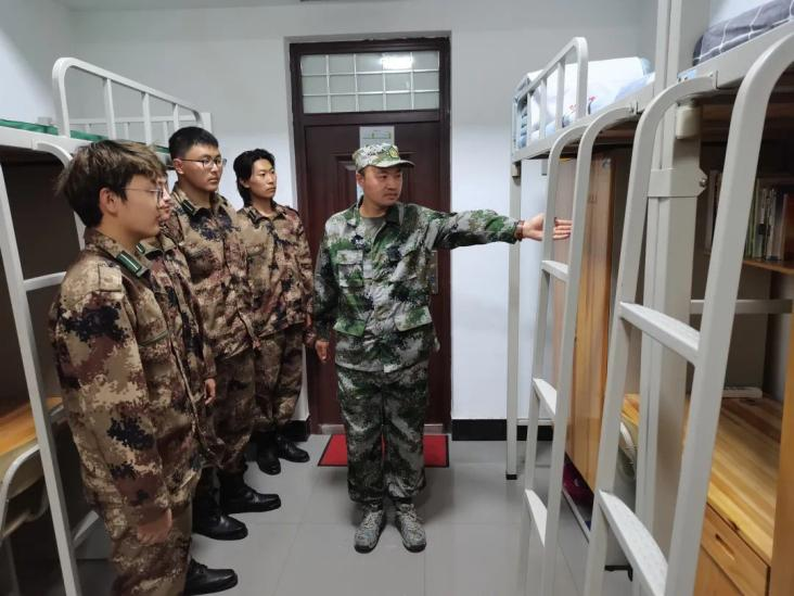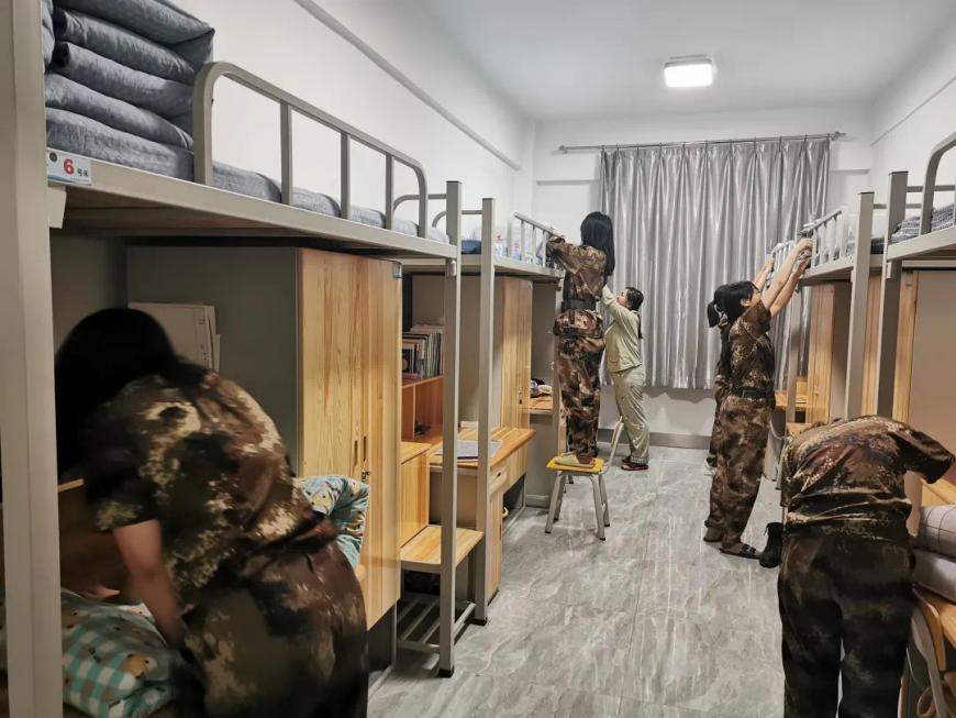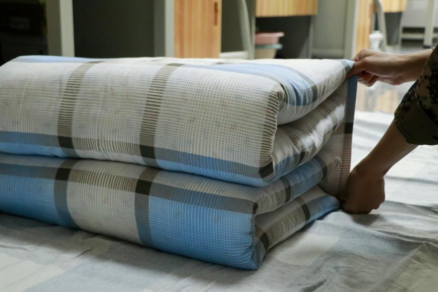 “出门看队伍,进门看内务。”内务整理是军训的必修课之一,整洁卫生的宿舍环境是度过美好大学生活的基础。“被子三分叠,七分修”,铺平、压实、翻折、抠角、捏线……在教官们悉心指导下一个整齐的“豆腐块”呈现在同学们的眼前。经过反复训练,同学们已经掌握了叠“豆腐块”被子的基本要领,进一步提升了内务整理能力。