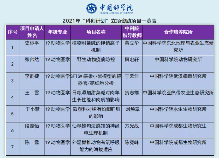 我校已连续七年组织学生申报该计划项目,项目立项后,学生将在中国科学院专家指导下开展研究,我校和中科院相关研究所将提供相应的科研条件支持。