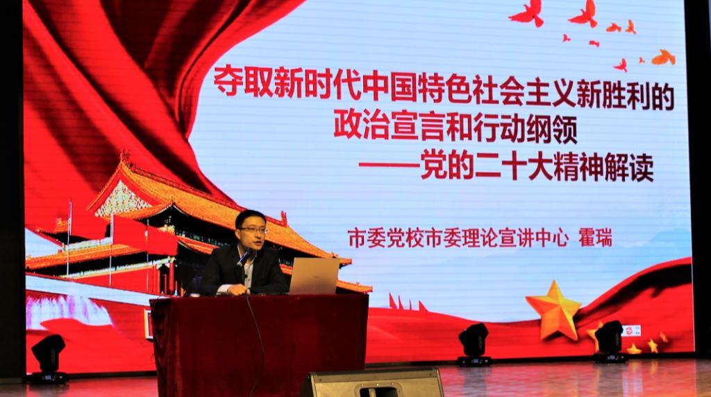 霍瑞以《夺取新时代中国特色社会主义新胜利的政治宣言和行动纲领 》为题,从新时代新征程中国共产党的使命任务、今后五年甚至更长时期的奋斗目标等方面作了深入阐释,对党的二十大的主题、主要成果,过去5年的工作和新时代10年的伟大变革,全面建设社会主义现代化国家的目标任务,坚持党的全面领导和全面从严治党,应对风险挑战,教育、科技、人才工作的部署,学习宣传贯彻党的二十大精神的要求等方面作了全面宣讲。